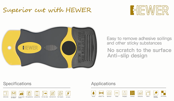 HEWER安全刮刀,既不會(huì)刮傷原來(lái)的物品,又能輕松去掉黏膠垢以及機(jī)器污垢等污漬;這款刮刀還可以輕松去除貼紙以及不干膠,而且還非常安全,不會(huì)刮傷自己,非常適合生活或者工作當(dāng)中使用。